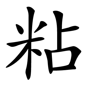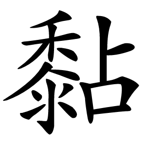 This character has a glyph for 'rice' on the left. It also has a glyph that originally meant 'divination' While it can be seen as the 'lighter' of the two 'stick/adhere' characters, it is said to be 'Yang' as paired with nián. There is a quality of 'licking a finger and picking up something' or 'sushi drawing up soy sauce with adhesion/capillary-action' |